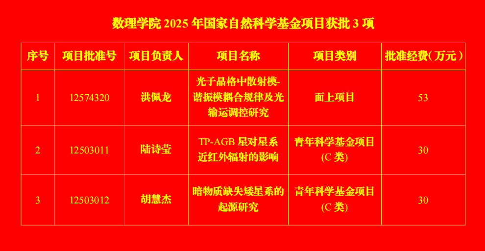 8月27日,国家自然科学基金委员会公布了2025年度国家自然科学基金项目的评审结果,william威廉中文官网洪佩龙副教授、陆诗莹博士和胡慧杰博士分别获批2025年度国家自然科学基金项目。洪佩龙副教授获批国家自然科学基金面上项目(项目号12574320,获批经费53万元),陆诗莹博士获批青年项目资助(项目号12503011,获批经费30万元),胡慧杰博士获批青年项目资助(项目号12503012,获批经费30万元)。