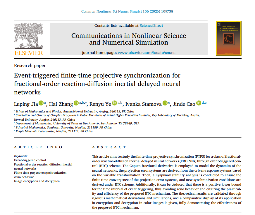 近日,2024级数学研究生贾露平以第一作者和导师团队在国际学术期刊《Communications in Nonlinear Science and Numerical Simulation》发表论文“Event-triggered finite-time projective synchronization for fractional-order reaction-diffusion inertial delayed neural networks”,导师张海教授为该论文通讯作者,该期刊影响因子3.8,中科院一区期刊。