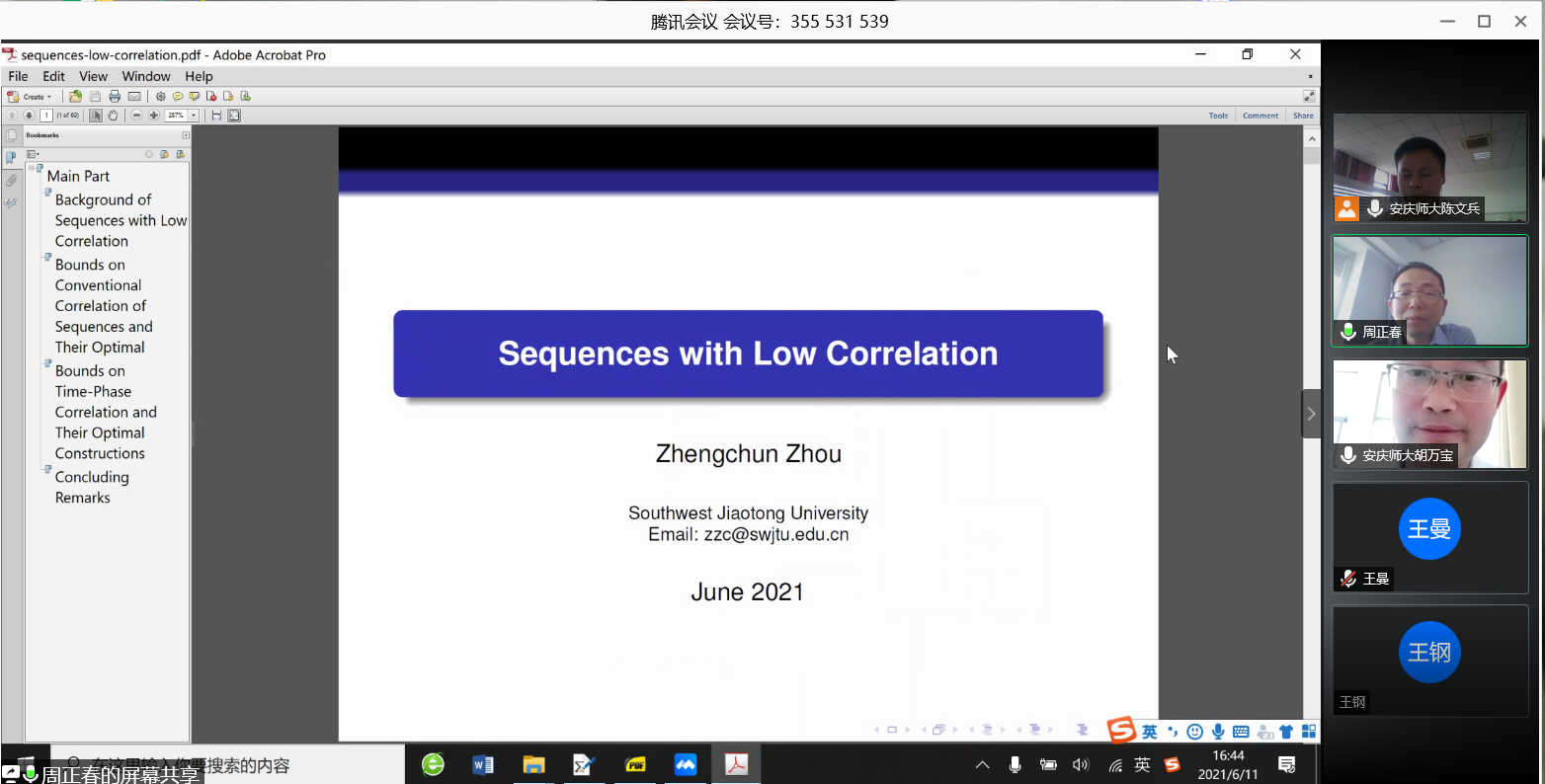 6月11日下午,西南交通大学数学公司周正春教授应william威廉中文官网邀请作了一场题为“Sequences with Low Correlation”的线上讲座报告。william威廉中文官网数学一级学科硕士点部分导师和研究生同学参加了本次报告会,报告会由william威廉中文官网胡万宝教授主持。
