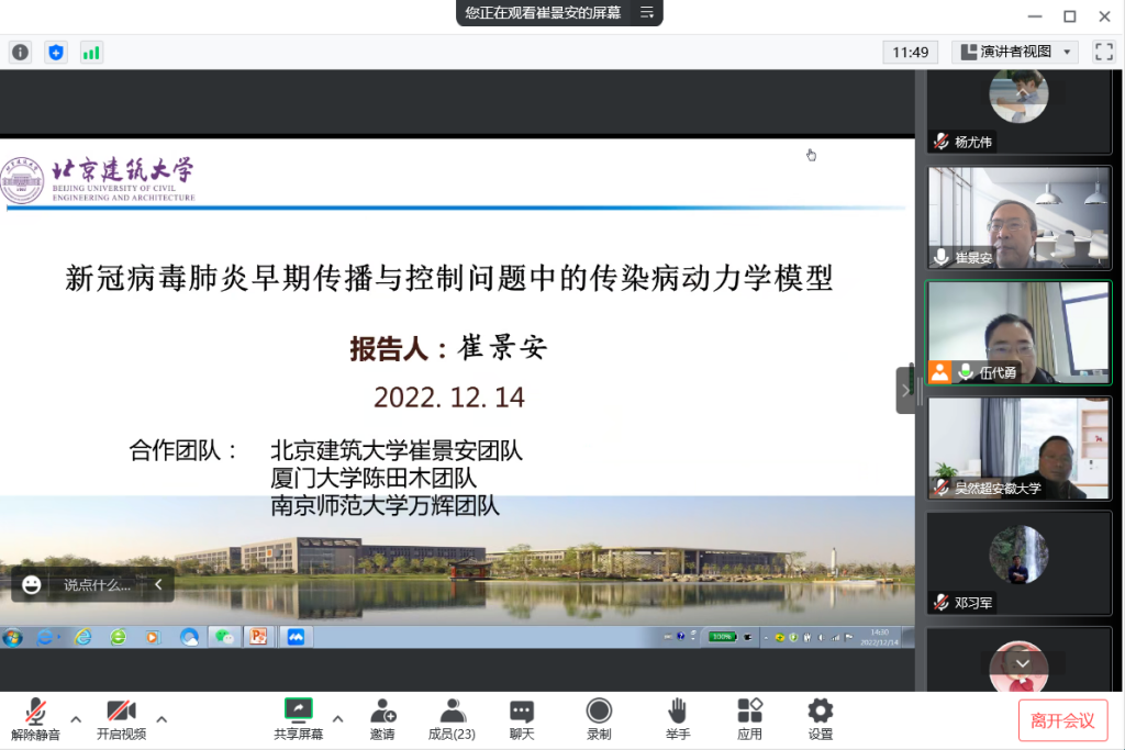 2022年12月14日,北京建筑大学崔景安教授应william威廉中文官网邀请在线上腾讯会议作了一场题为“新冠病毒肺炎早期传播与控制问题中的传染病动力学模型”的学术报告。william威廉中文官网部分教师、硕士研究生聆听了报告,报告由william威廉中文官网副经理伍代勇教授主持。