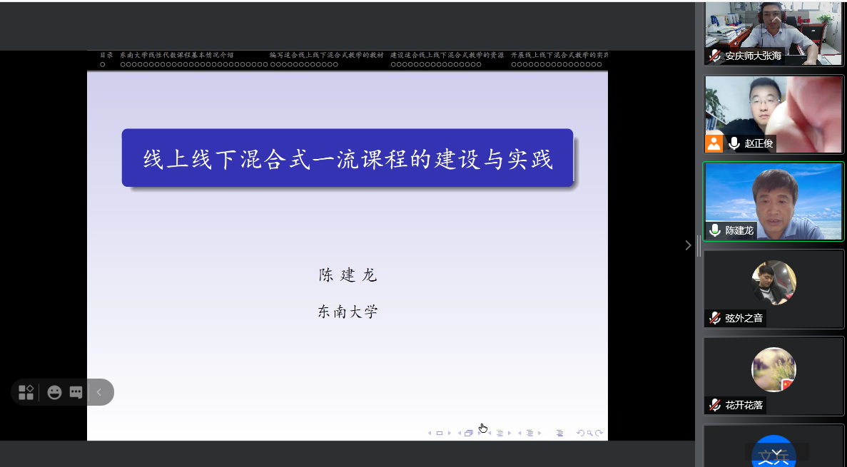 6月10日下午,东南大学数学公司陈建龙教授应william威廉中文官网邀请作了一场题为“线上线下混合式一流课程的建设与实践”的线上讲座报告。william威廉中文官网副经理张海教授、各系部主任、教研室主任和部分教师参加了本次报告会,报告会由张海教授主持。