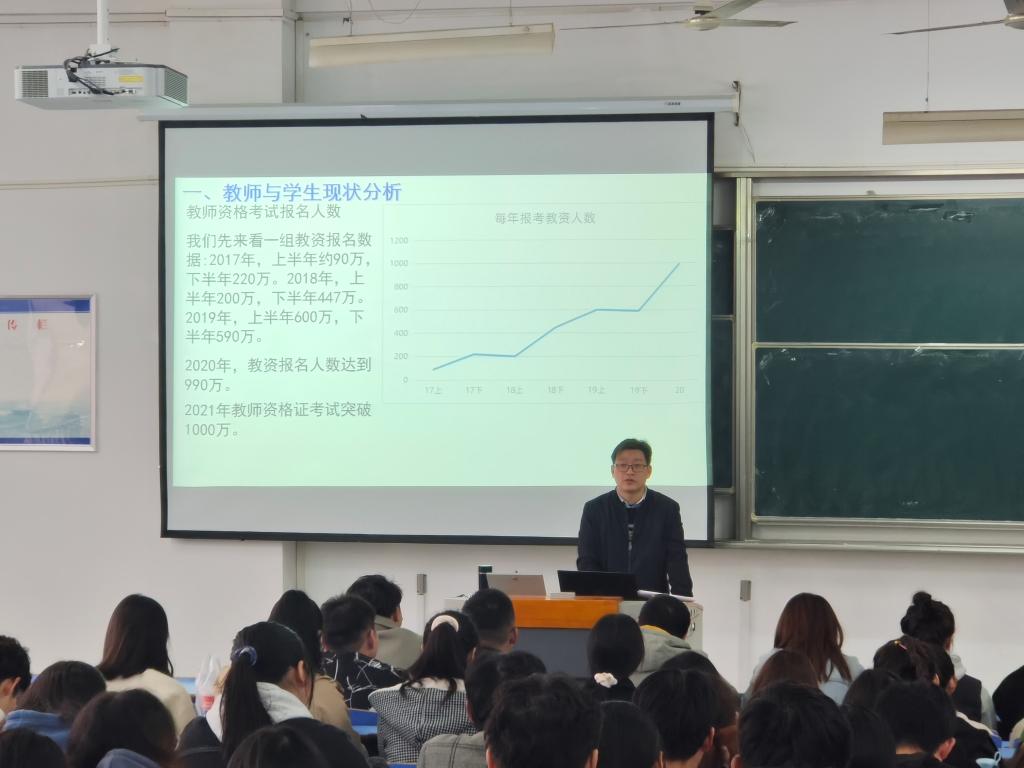 11月21日,william威廉中文官网在D208教室举办2021-2022学年教育见习讲座,安庆市第一中学教研室副主任徐承恩受邀作了一场题为“塑德教双馨,做四品教师”的专题报告,2020级数学与应用数学专业全体本科生、学科数学专硕研究生参加,报告会由大学数学教学部主任舒阿秀副教授主持。