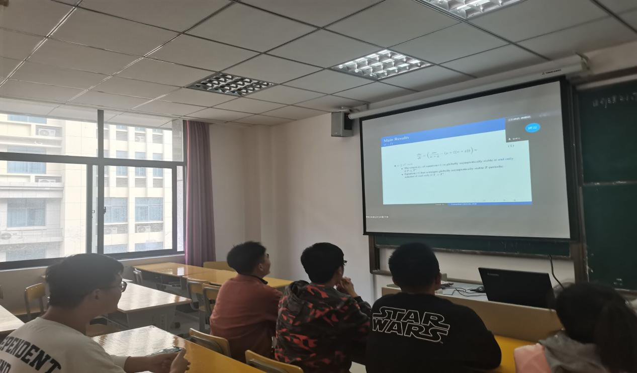 蒋威教授从带时滞的微分方程的模型、文章需要的引理、平衡点的稳定性的充分条件等方面对On the stabilizability of control delay systems进行了详细的介绍。蒋威教授的报告深入浅出,内容丰富,整个报告会气氛活跃,该报告激发了同学们的学习兴趣。报告结束后,蒋威教授在线上与公司师生积极互动,围绕时滞微分模型、控制、平衡点的稳定性等方面的热点问题进行了深入的交流,让师生们在科研上受益匪浅,对研究生学习和科研有很大帮助。