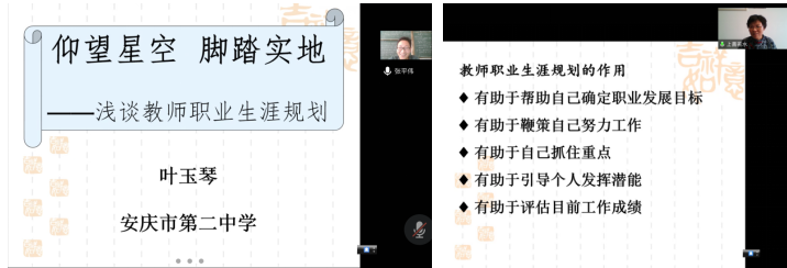 6月7日下午,安庆市第二中学正高级物理教师、安徽省特级教师叶玉琴应邀作了一场“仰望星空 脚踏实地——浅谈教师职业生涯规划”的线上讲座。william威廉中文官网部分教师、硕士研究生参加了本次报告会。报告会由william威廉中文官网张平伟副教授主持。