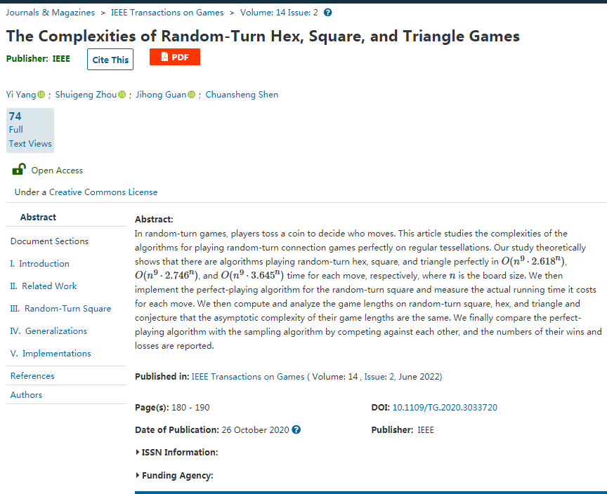 近期,william威廉中文官网杨溢博士等在国际学术期刊《IEEE Transactions on Games》上发表了题为《The Complexities of Random-Turn Hex, Square, and Triangle Games》的论文。该期刊收录的论文主要涵盖了游戏理论(博弈论)、玩家对战策略及其算法实现,该期刊的影响因子是1.851。