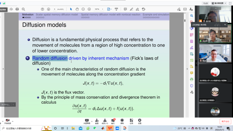 5月13日,杭州师范大学宋永利教授应william威廉中文官网邀请在腾讯会议线上作了一场题为“空间记忆扩散模型的新进展”的学术报告。william威廉中文官网部分教师、硕士研究生聆听了报告,报告由伍代勇教授主持。