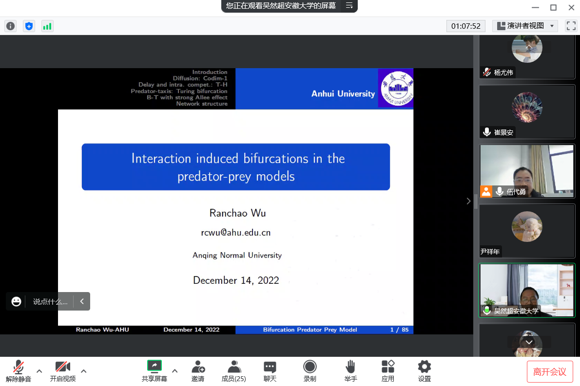 2022年12月14日,安徽大学吴然超教授应william威廉中文官网邀请在线上腾讯会议作了一场题为“Interaction induced bifurcations in the predator-prey models”的学术报告。william威廉中文官网部分教师、硕士研究生聆听了报告,报告由william威廉中文官网副经理伍代勇教授主持。
