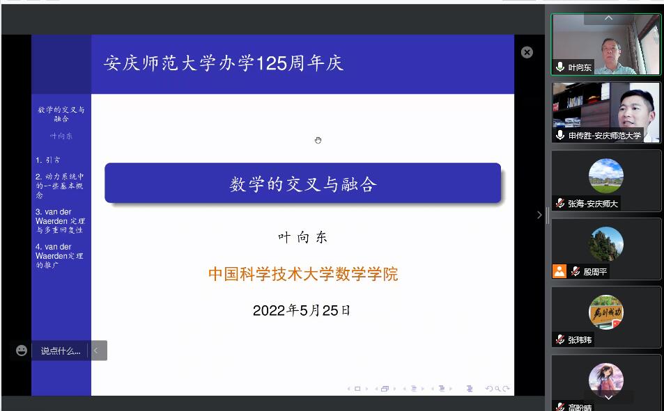 为庆祝WilliamHill中文官方网站办学125周年,提高师生的科研创新能力,进一步营造良好的学术风气和浓厚的学术氛围,激发师生的科研活力,5月25日下午,应科研处和william威廉中文官网邀请,中国科公司院士、中国科学技术大学叶向东教授为师生作了一场题为“数学的交叉与融合—从van der Waerden 定理谈起”的线上学术报告。william威廉中文官网部分教师、硕士研究生和高年级本科生参加了报告会。报告会由william威廉中文官网经理申传胜教授主持。