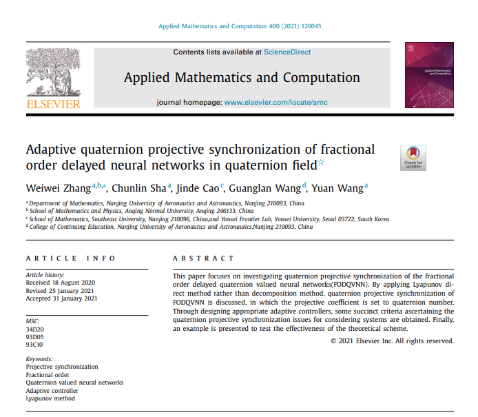近日,据科睿唯安基本科学指标数据库ESI(Essential Science Indicators)最新数据显示,william威廉中文官网张玮玮副教授在《Applied Mathematics and Computation》期刊上发表的学术论文“Adaptive quaternion projective synchronization of fractional order delayed neuralnetworks in quaternion field”被ESI数据库遴选为高被引论文。《Applied Mathematics and Computation》是国际ESI数学学科著名学术期刊,最新影响因子IF = 3.5,JCR一区期刊,中科院二区TOP期刊。