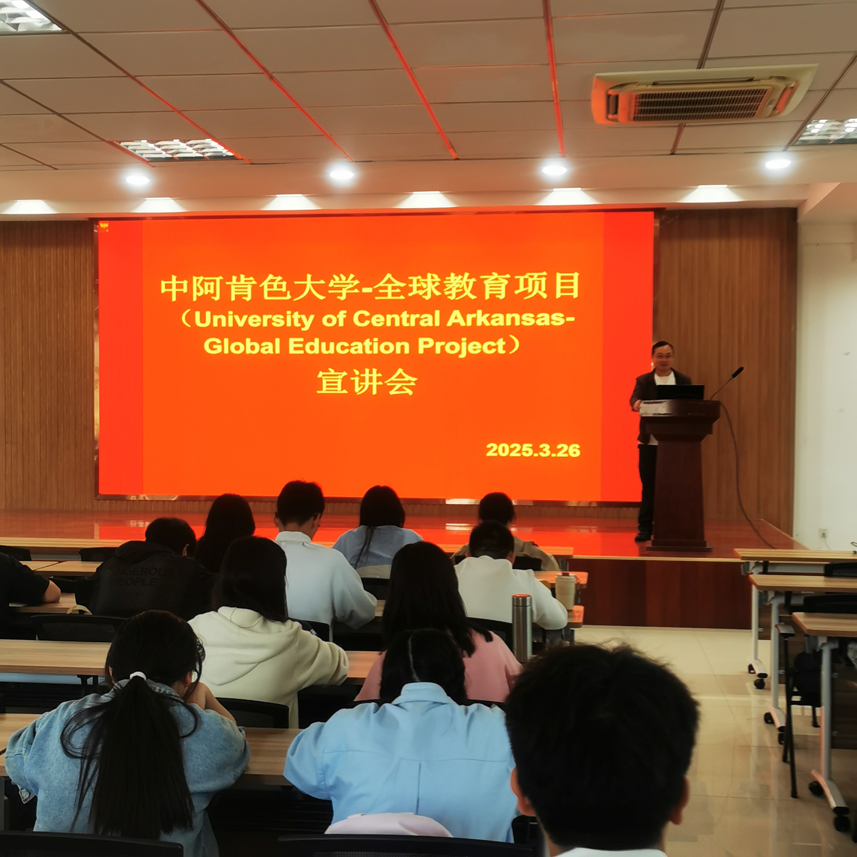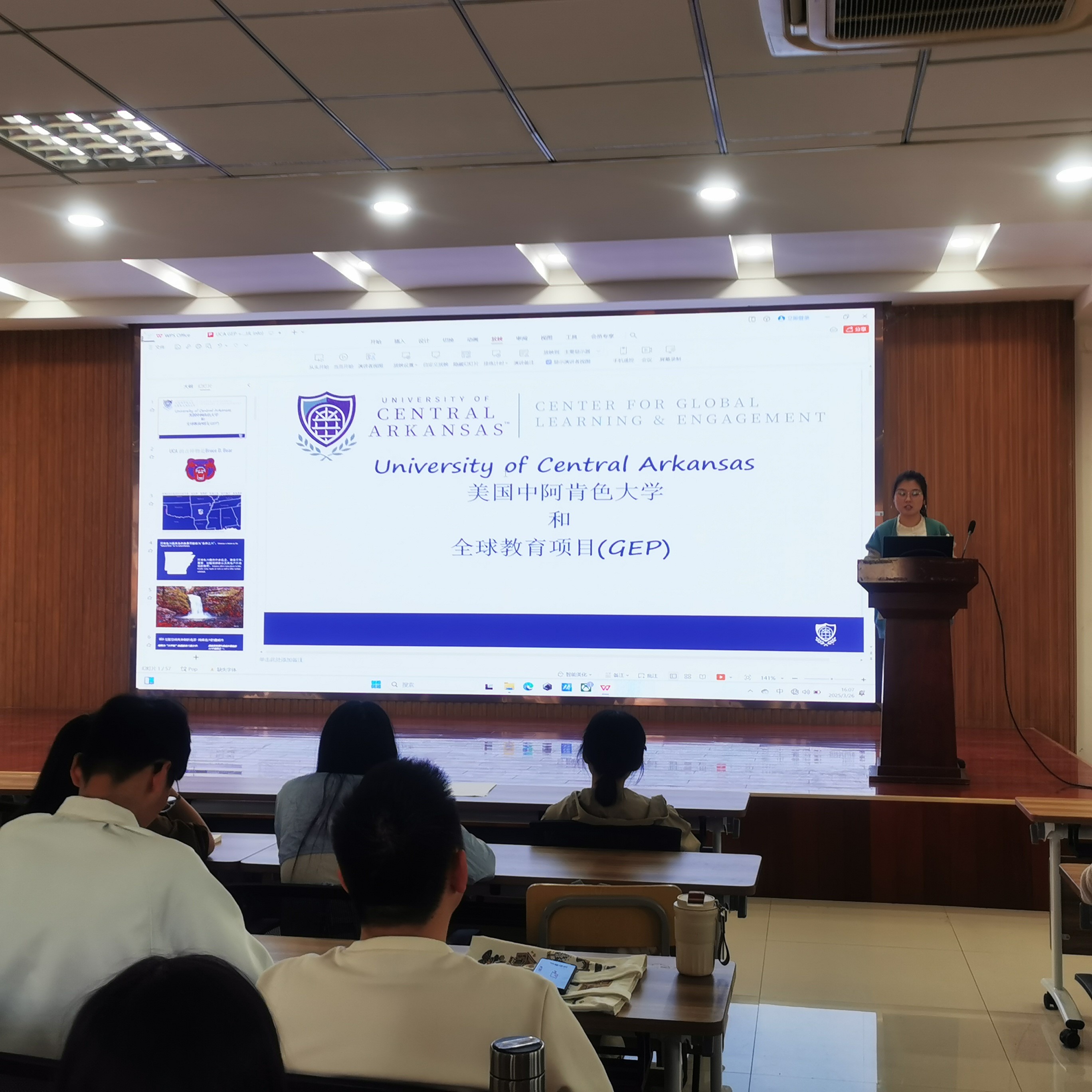 宣讲会上,项目合作方代表甄雨萌老师介绍了中阿肯色大学的校园环境、办学特色、优势学科及课程设置,重点解读了中阿肯色大学全球教育项目的合作模式与培养目标,以及项目申请流程,针对同学们关注的留学费用、奖学金政策等问题进行了细致说明,并现场解答了同学们的疑问。