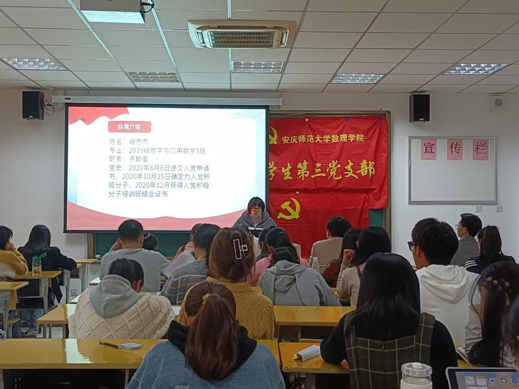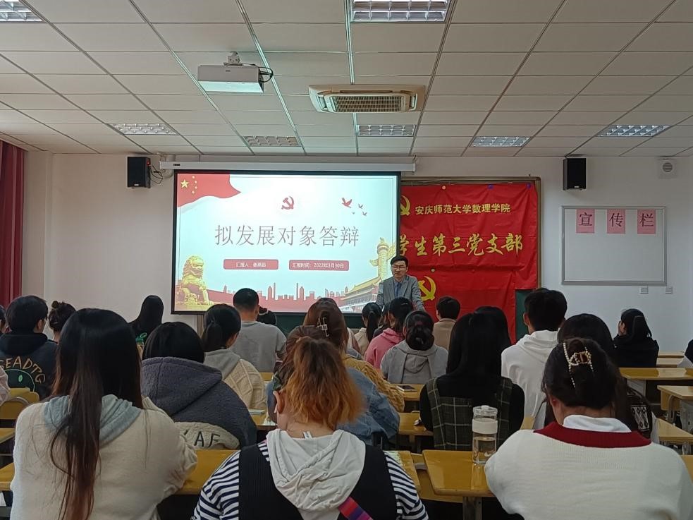 会议开始,支部书记黄兴强老师介绍了本次拟发展对象答辩大会的会议议程,根据大会议程,答辩流程分为PPT展示和现场问答两个环节。参加答辩的拟发展对象依次上台进行PPT汇报,汇报内容包括对党的认识、入党动机以及培养考察期间内的思想认识,学习生活等。支部书记和正式党员通过现场提问环节,全面考察了他们对于党史知识、党的思想理论和方针政策的掌握情况。结合拟发展对象的PPT展示、现场问答环节表现以及综合表现,支部正式党员对拟发展对象进行综合打分,会后,支委会确定了发展对象人选。