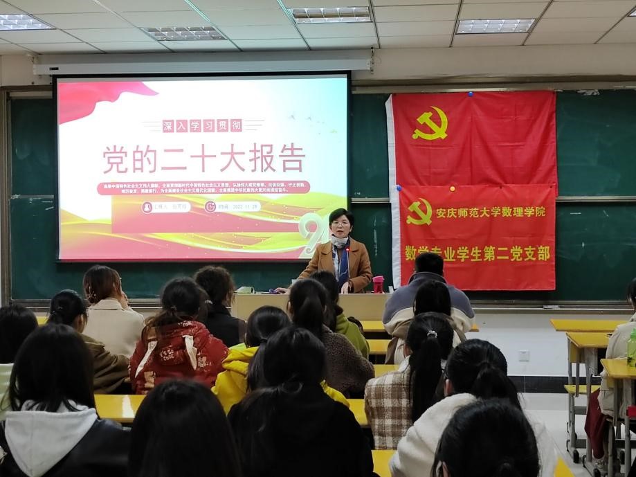 为深入学习宣传贯彻党的二十大精神,统一思想凝聚力量,11月29日,数学专业员工第二党支部在数理楼204教室举办党的二十大精神宣讲会,公司党委副书记彭芳珍作报告。数学专业员工第二党支部全体党员、入党积极分子以及公司代数几何教工党支部全体党员近百人参加了报告会。