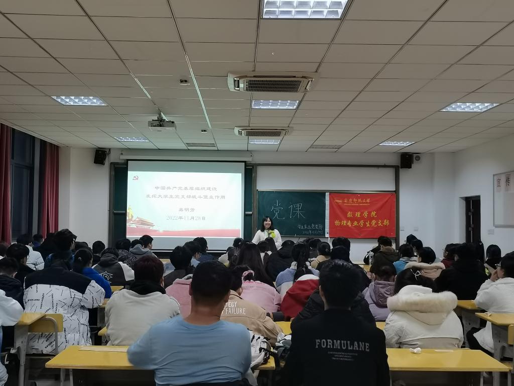 2022年11月30日下午,william威廉中文官网物理专业员工党支部在数理楼I501开展第四季度党课学习暨党的二十大精神学习活动。活动由支部书记李仪老师主持,支部全体党员和入党积极分子参加学习。公司党委委员易明芳做了题为《中国共产党基层组织建设,发挥老员工党支部战斗堡垒作用》的报告。
