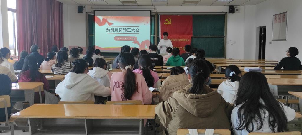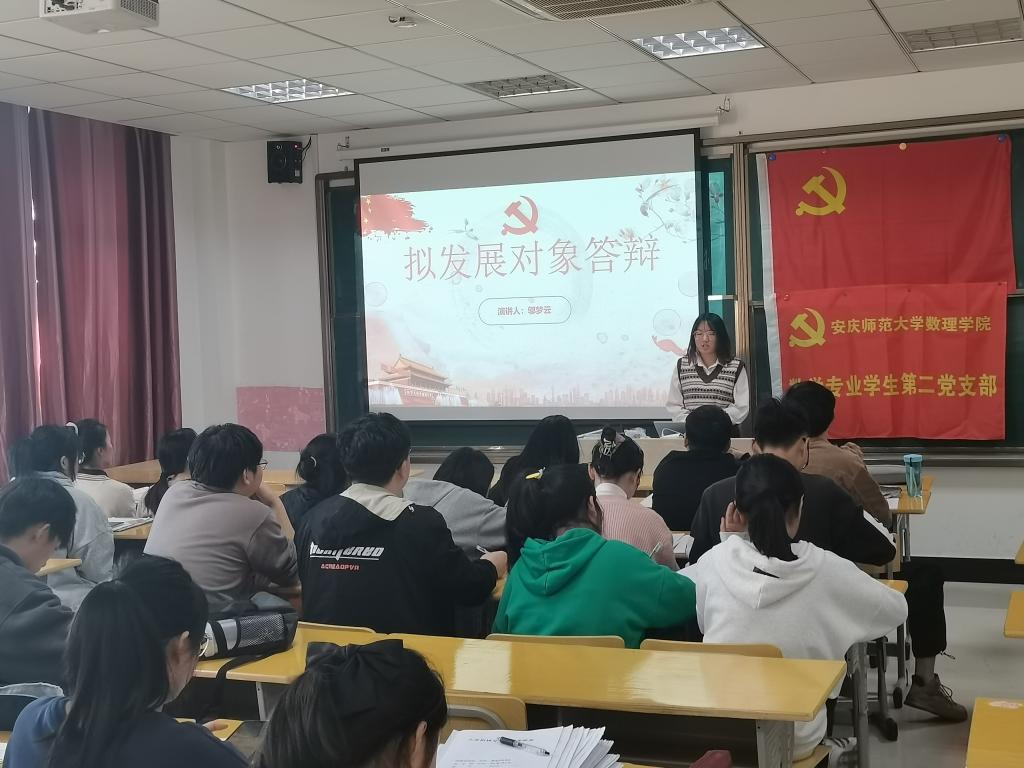 接着进行会议第二项内容:拟发展对象答辩大会。支部书记汪健老师介绍了本次拟发展对象答辩大会的会议议程,根据大会议程,答辩流程分为PPT展示和现场问答两个环节。参加答辩的拟发展对象依次上台进行PPT汇报,汇报内容包括对党的认识、入党动机以及培养考察期间内的思想认识,学习生活等。支部书记和正式党员通过现场提问环节,全面考察了他们对于党史知识、党的思想理论和方针政策的掌握情况。结合拟发展对象的PPT展示、现场问答环节表现以及综合表现,支部正式党员对拟发展对象进行综合打分,会后,支委会确定了发展对象人选。