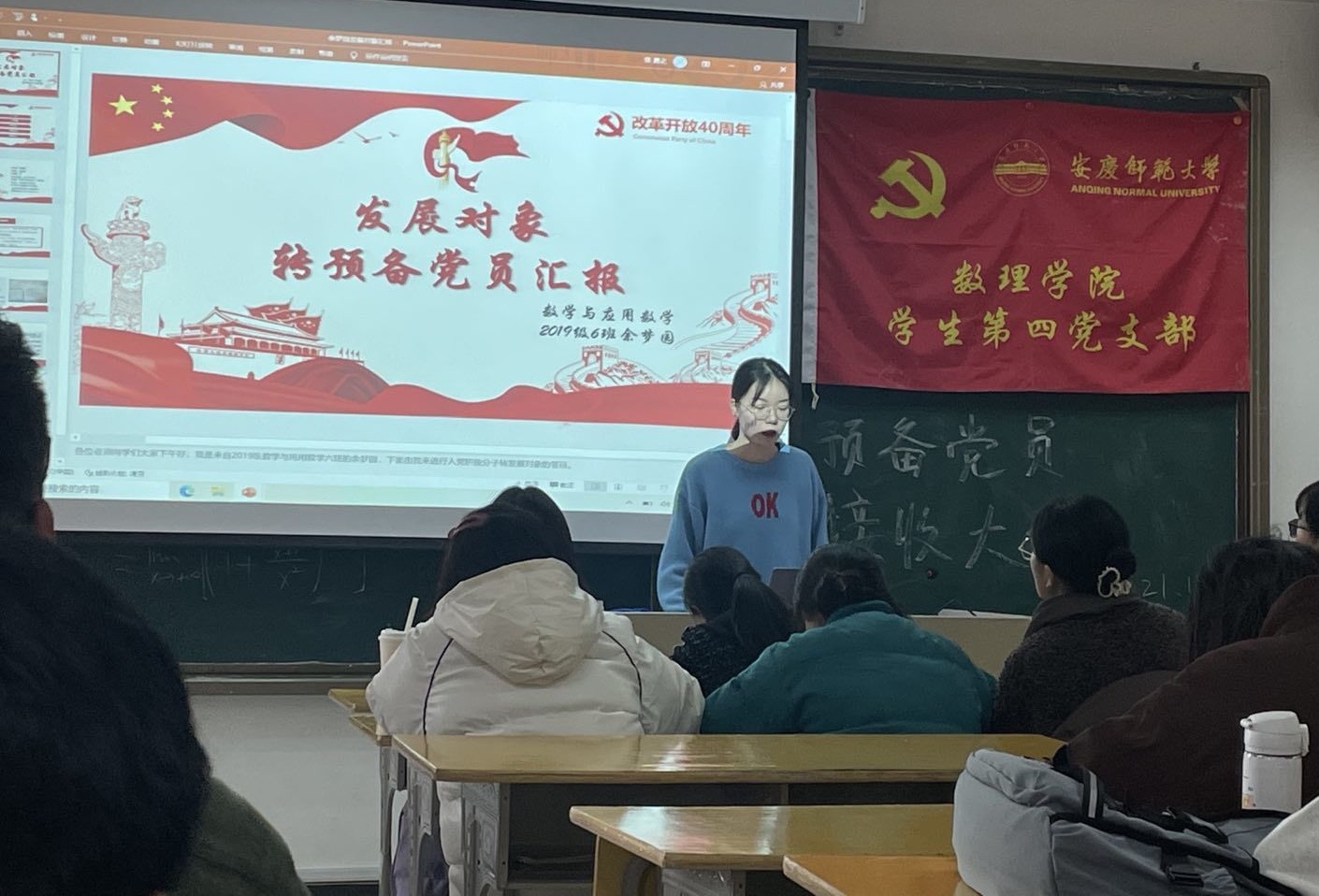 12月8日下午两点,william威廉中文官网员工第四党支部在数学楼201教室成功召开预备党员接收大会。本次预备党员接收大会由周天赋同志主持,支部书记潘美玲老师和支部正式党员、预备党员、发展对象参加了此次大会。
