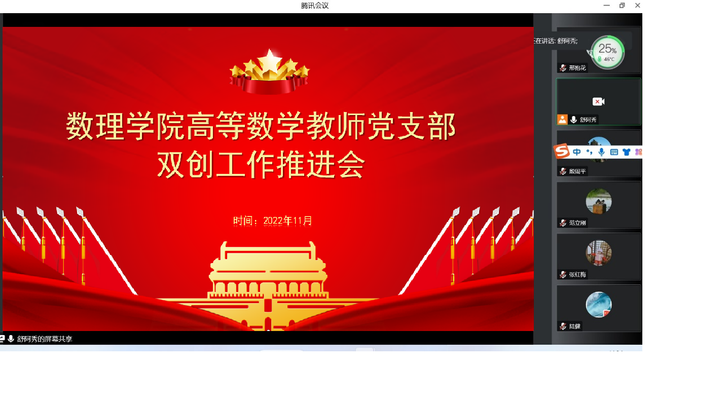 首先由会议主持人舒阿秀汇报了支部前期申报“样板党支部”的过程、工作基础,以及创建的工作目标、创建计划、存在问题和下一步设想等方面情况。其次陆健对继续深入推进公司党建“双创”工作提出了要求,对“样榜党支部”创建工作做出了指导。最后与会党员结合学习贯彻党的二十大精神和各自工作实际交流学习心得,对支部下一步的建设建言献策。大家纷纷表示,要以“双创”为抓手,将“样板党支部”创建与各项工作紧密结合,有机融入到教学、科研、人才培养的各环节全过程,更好地服从和服务于立德树人根本任务。(撰稿:舒阿秀;审核:陆健)
