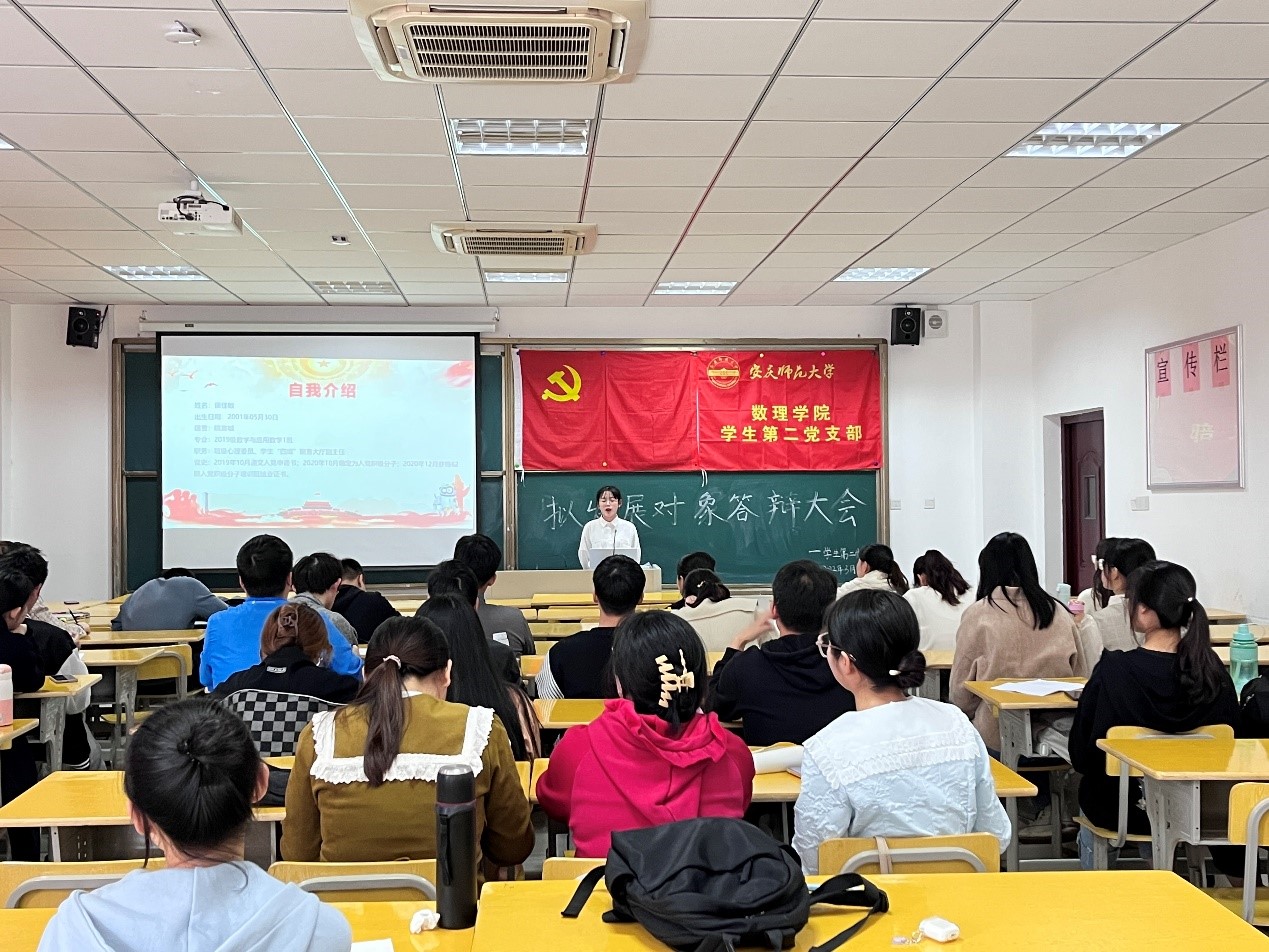会议伊始,周子豪同志向我们介绍了本次答辩大会的具体流程。拟发展对象答辩是党组织探索发展新党员的重要尝试也是提高党员发展质量的关键环节。支部书记滕秀花老师强调拟发展对象答辩要秉持公平、公开、公正的原则,坚持严把党员发展质量关,积极为党组织遴选优秀人才。