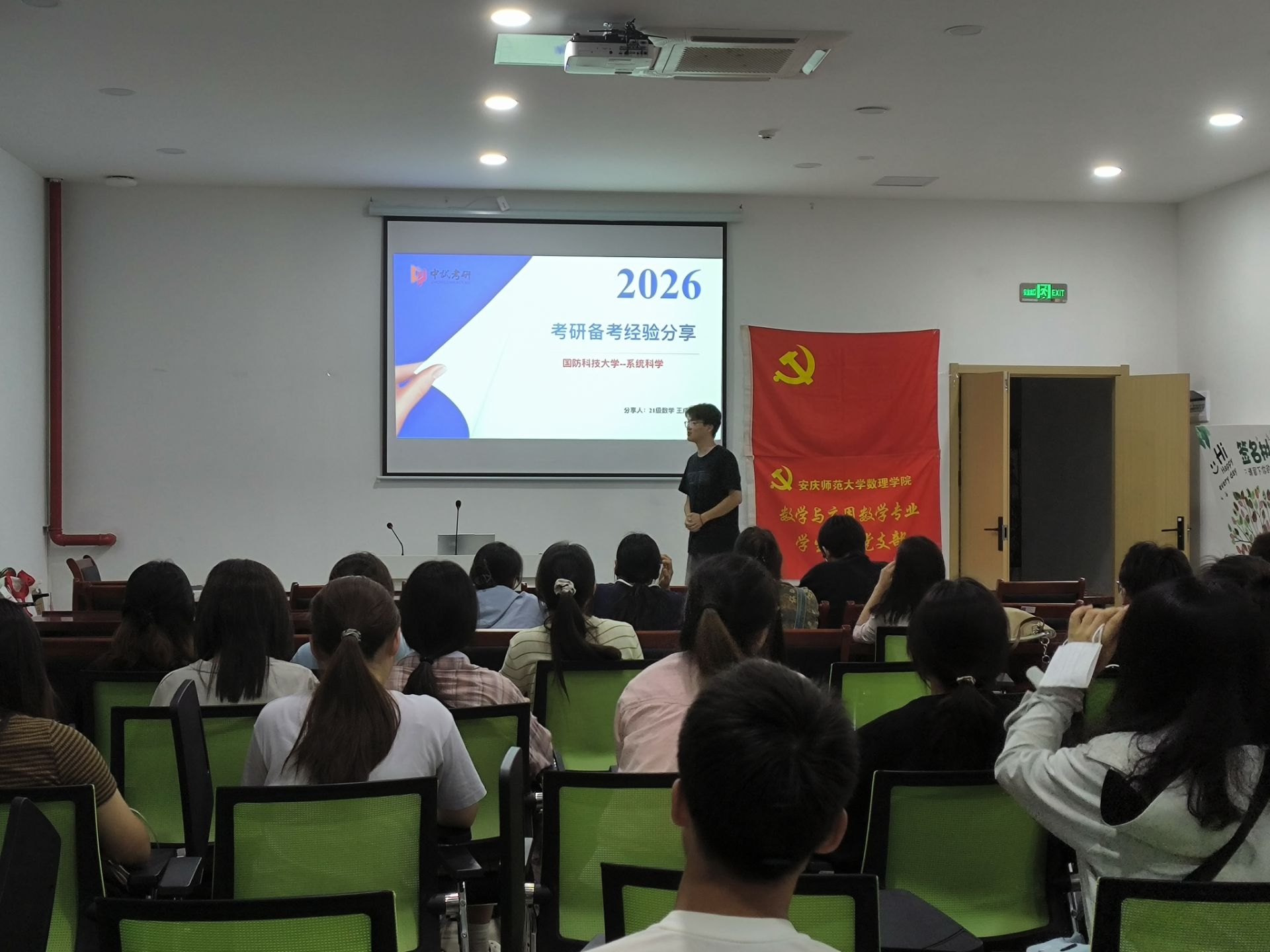 活动中,考入南京师范大学的2021级数学4班王灿同学率先分享,他以“心态是最好的风水”为核心,细致回顾备考历程,强调在压力与挑战中保持积极心态的关键作用;跨专业考取国防科技大学系统科学专业的王成超同学,则从院校专业选择策略、各科备考方法及复试应对技巧等切入,深度分享跨考途中如何突破专业壁垒,用坚定信念叩开理想院校大门;被长江大学录取的邢舒奕同学聚焦“选择、规划、方向、坚持”四个维度,为支部成员勾勒出逻辑清晰、实操性强的备考框架,助力精准锚定目标、科学制定计划。