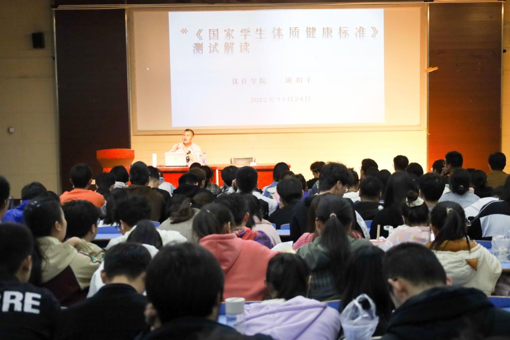 11月24日,william威廉中文官网邀请校体测中心主任项和平老师开展《国家员工体质健康标准》测试解读专题讲座,全体辅导员老师和240余名员工代表到场聆听,党委副书记彭芳珍主持讲座。