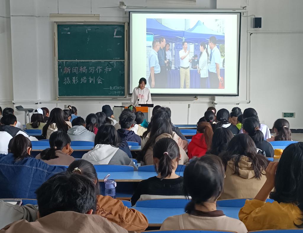 校记者团文字记者权琪同学从新闻稿的结构、标题、导语这三个方面展开。她向大家介绍什么是新闻、校园新闻以及新闻稿写作重点——标题、导语、结构。新闻稿标题要求凝炼具有叙事性且突出要点,并结合校园网上的新闻稿件列举出几种导语的写作方法。摄影记者金格从常见新闻题材拍摄、摄影构图原则、摄影技巧和新闻图片的文字说明四个方面,讲解新闻摄影的相关知识和注意事项。她向大家讲解了新闻摄影的具体含义,普及了光圈、快门和ISO感光度等摄影专业知识。
