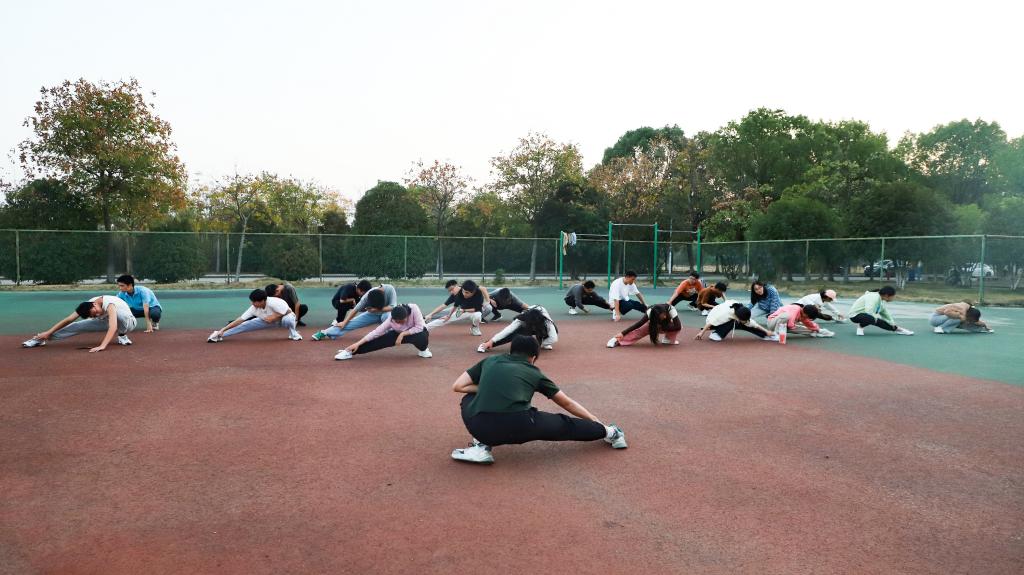 扩胸伸展、弓步压腿、屈膝弹跳……退役复学员工、数学专业2020(2)班的陈旭作为活动首日的领跑队长,在开跑前先带领同学们进行热身运动,避免运动过程中可能造成的身体损伤。在带队跑步时,他指导并规范了员工们的长跑动作和气息调节方式。“体育运动已经成为我们生活中不可或缺的一部分。”他坦言,“希望大家可以将锻炼融入日常生活,激发自觉参与运动的热情,保持积极阳光的运动心态。”