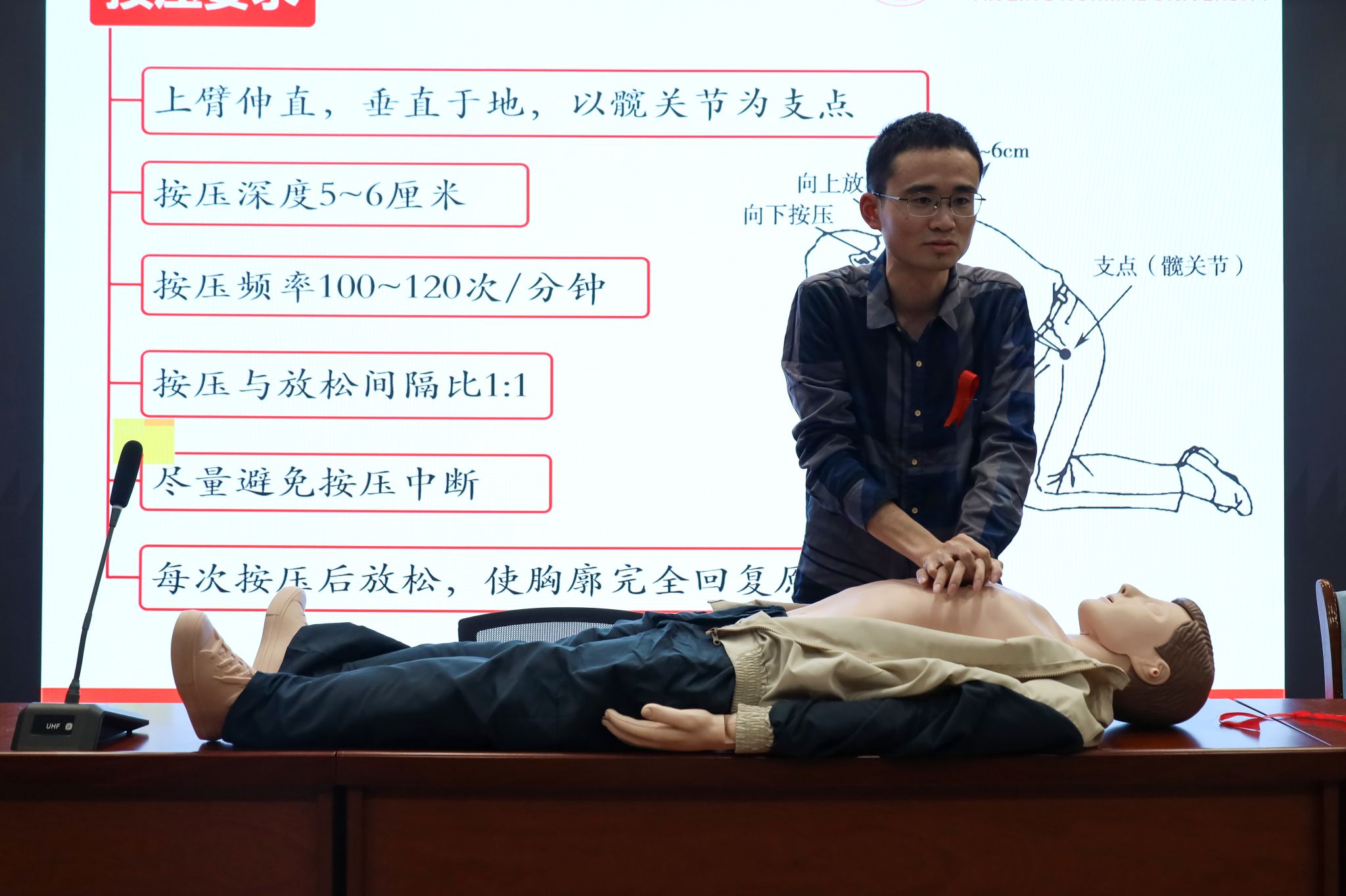 “先生先生,能听到吗?”校医院医师朱琳通过现场演示为员工们讲解着急救知识。“在进行心肺复苏术前要确认现场的安全,同时指定某人拨打急救电话120。”朱琳表示,心肺复苏术是一项重要的急救技能,可以帮助人们在紧急情况下挽救生命,员工们要提高自己的急救能力和应对突发状况的能力。