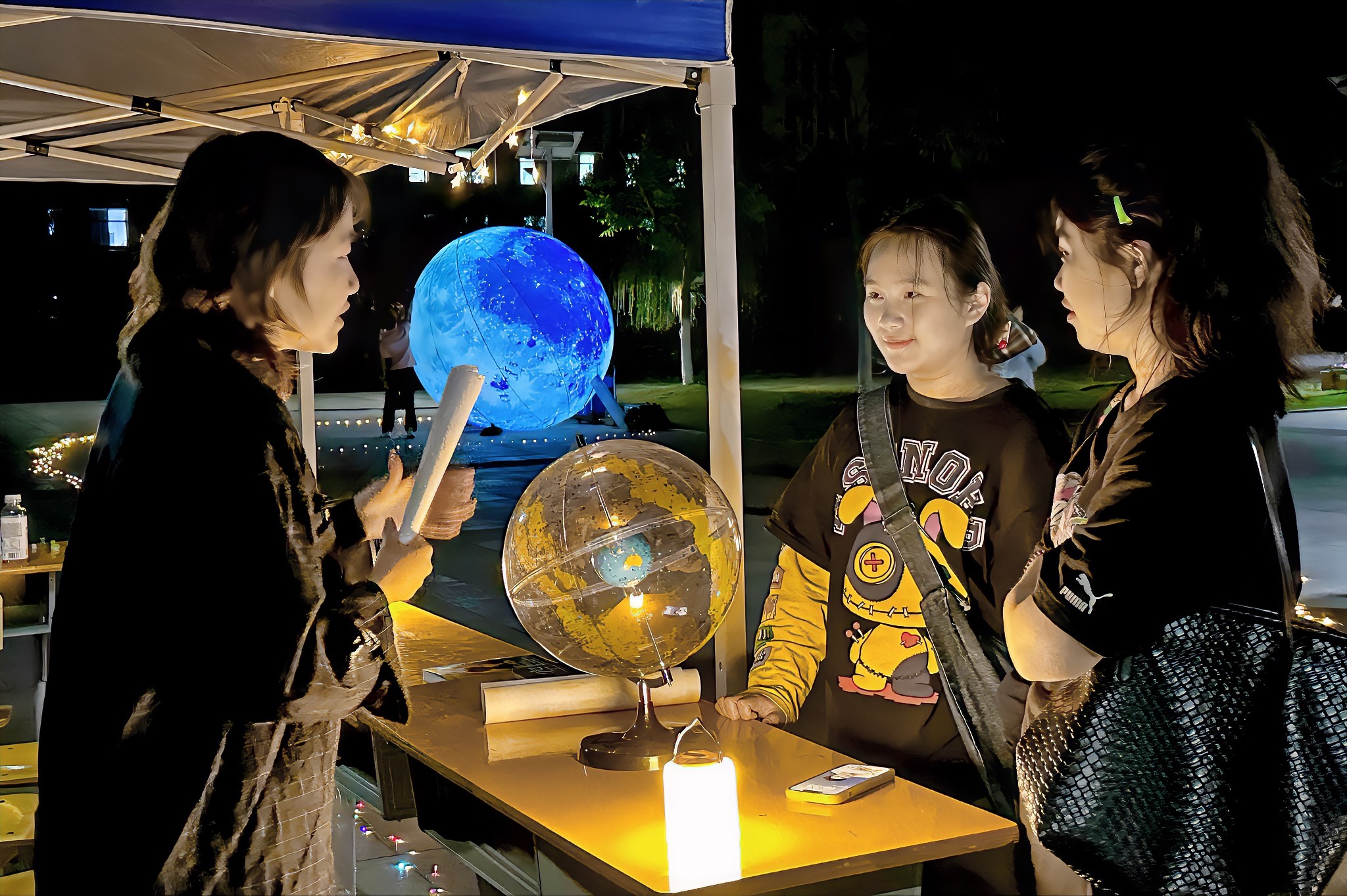 安装低倍率目镜,不断调整天文望远镜的焦距与瞳距,在工作人员、地理科学专业2023(3)班孙浩天的指导下,木星、火星等星体通过天文望远镜呈现在了前来星空观测区体验的员工的眼前。“透过天文望远镜,我甚至可以看到环绕在木星旁的部分伽利略卫星。”英语专业2022(6)班的胡心蕊分享,作为协会的老成员,每一年的“天文之夜”她从不缺席,于她而言,观测远在天边的星体,就像是在和宇宙对话。