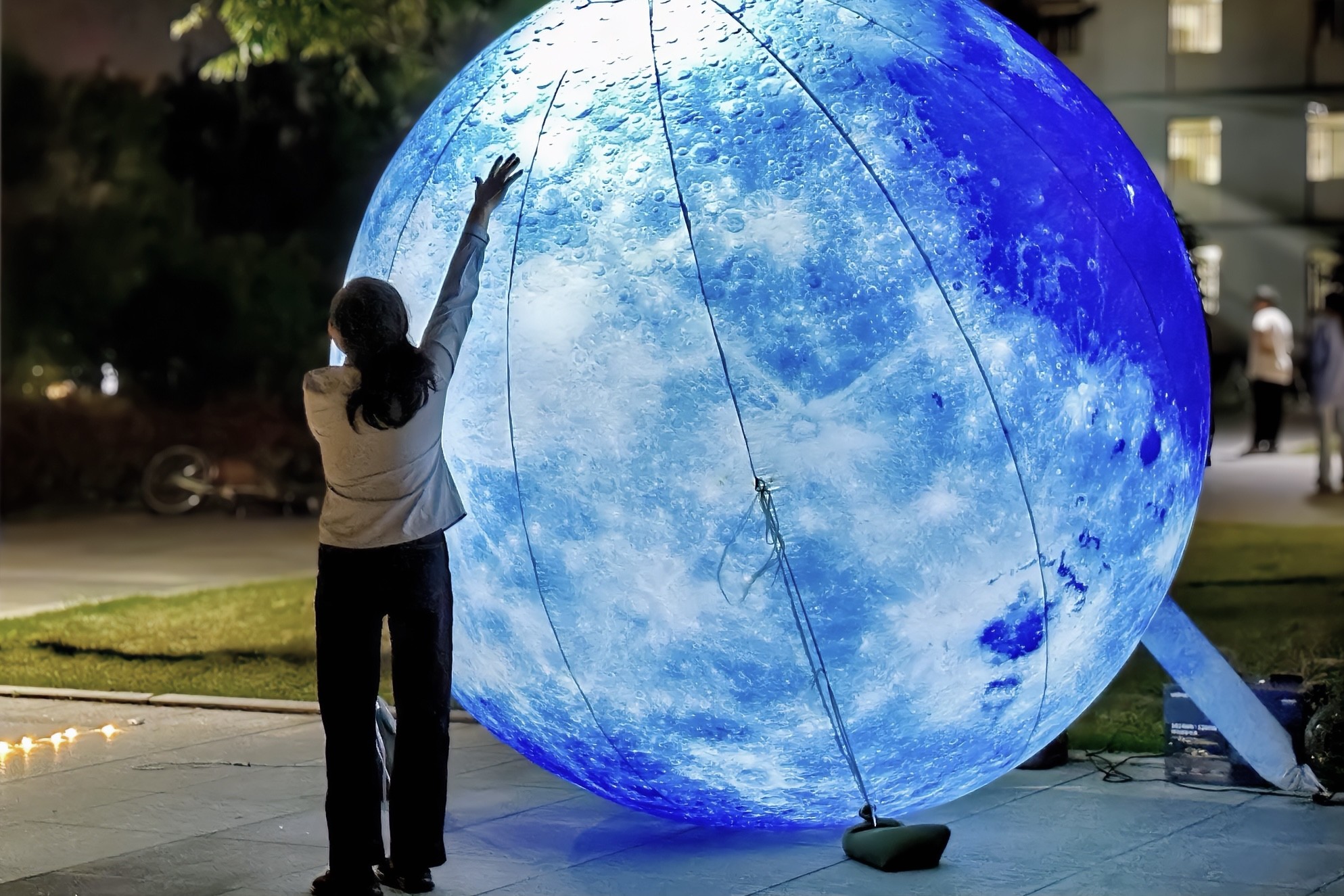 “本次活动设置了集章打卡,大家在体验过不同区域的活动后可以集章留念。”活动负责人、物理学专业2022级(1)班的陈君向前来参与活动的员工介绍着。提前一周,陈君与协会成员就在思考“如何使参与活动的员工有更好的体验感”。经过数次商讨,成员们最终决定将现场划分为星空观测区、月球合照区、模型海报展示区和实验游戏区四个区域,并将LED灯条铺设在地面进行划区。“现场布置完果然很有‘氛围感’。”陈君笑着说。