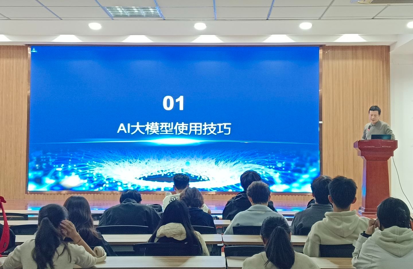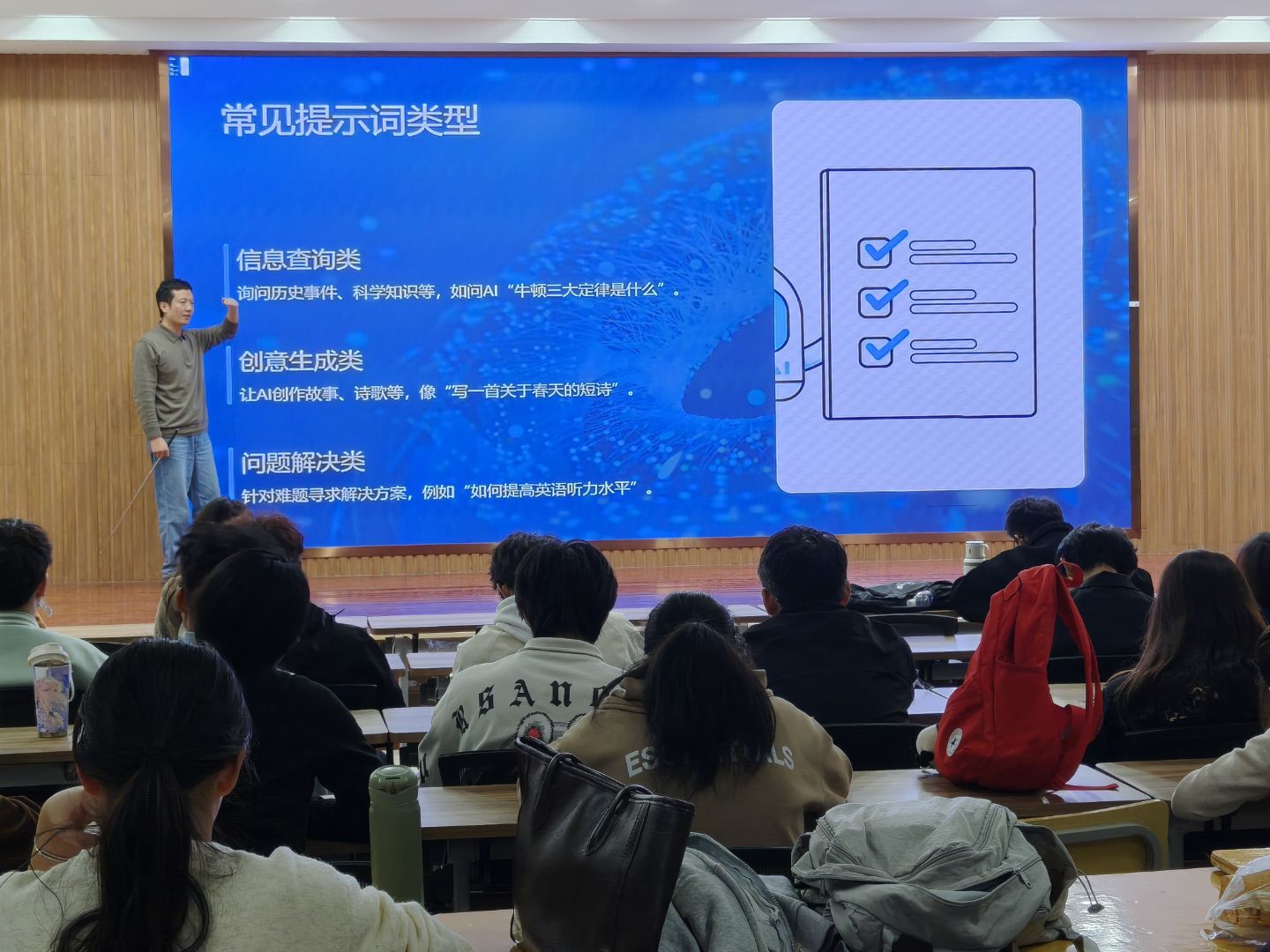 徐骏老师从提示词公式入手,系统讲解了AI大模型的使用技巧,给出了“身份+背景+任务+要求”的提示词公式,通过知识库构建、考研英语辅导、社团活动策划、新闻稿撰写等生动案例,演示了如何通过高质量提问获取高质量回答。现场同学积极参与互动,在徐老师的引导下掌握了与AI高效对话的基本方法。