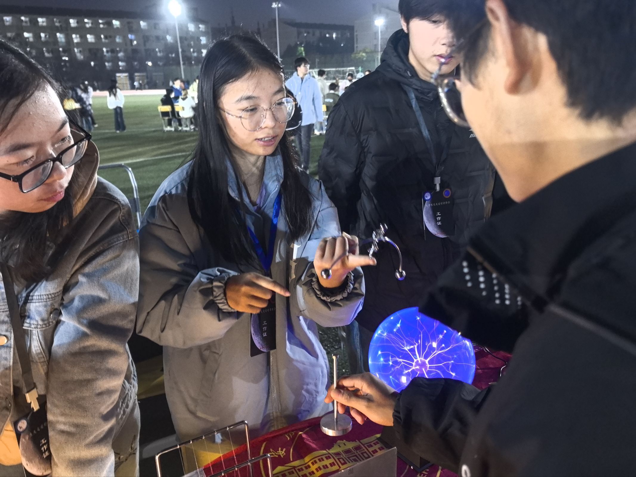 夜幕降临,东门操场灯光微亮,帐篷林立,人流如织。活动在轻松愉快的氛围中拉开帷幕。各协会摊位前围满了好奇的同学,天文望远镜前排队观测的师生络绎不绝。磁悬浮列车、等离子脉冲炮、混沌摆、太阳系模型等趣味实验装置,将抽象的物理知识转化为直观有趣的互动体验,让参与者在动手实践中感受科学的魅力。