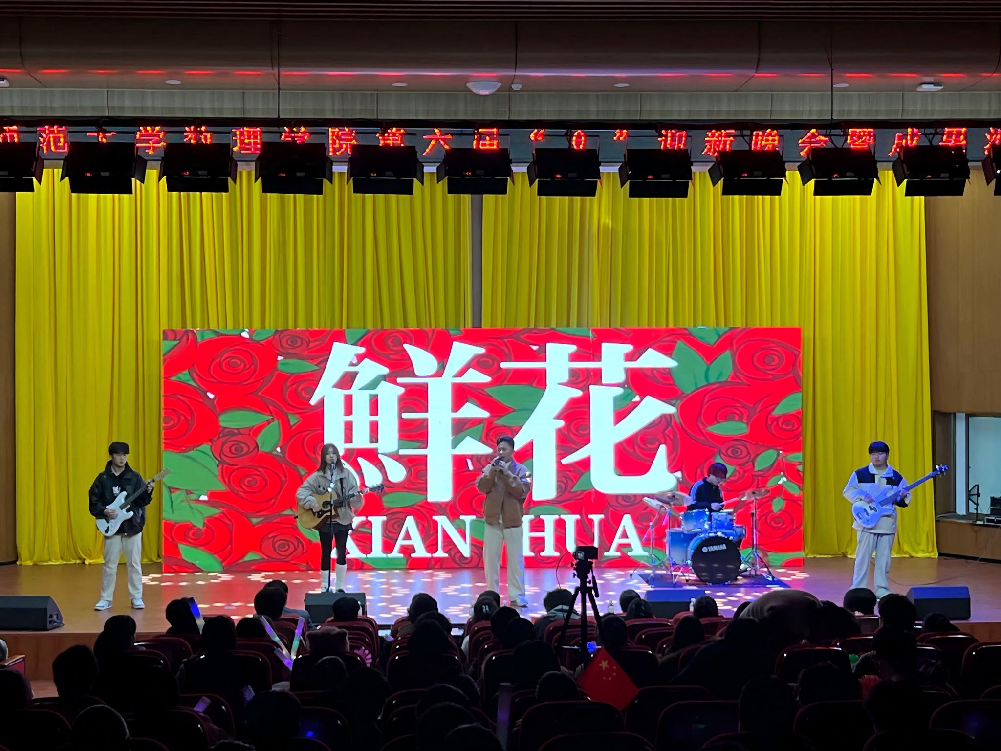 在耿西汀乐队激情澎湃的开场曲《鲜花》中,晚会正式拉开帷幕。本次晚会共分为“星光璀璨,迎新之夜”“岁月如歌,盛世华章”“风华正茂,逐梦前行”“梦想起航,共筑未来”四个篇章,节目形式丰富多样,涵盖歌曲、舞蹈、相声、朗诵、舞台剧等。此外,晚会还通过抖音平台进行直播,方便未能到场的师生“云”赏精彩。