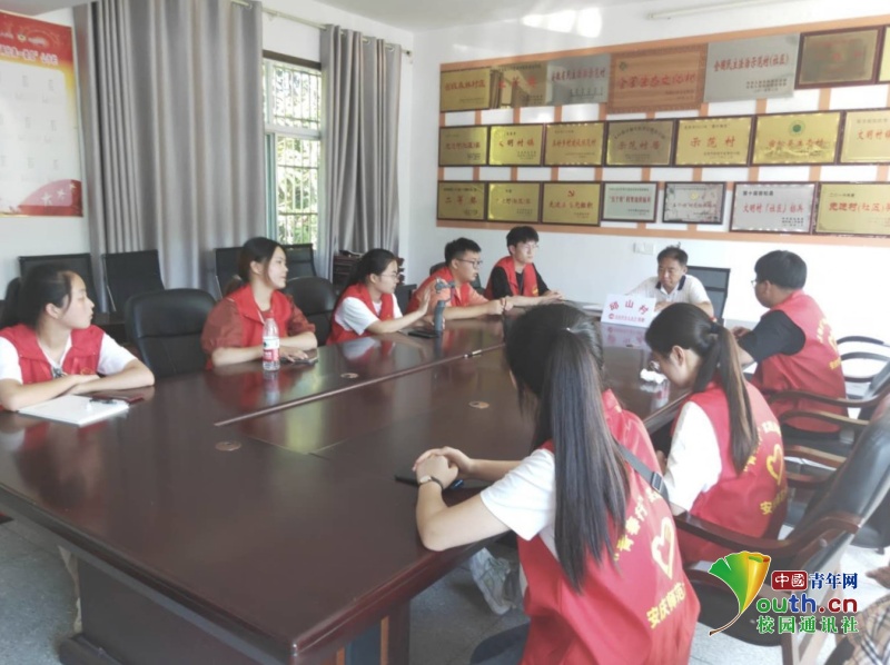 图为邱山村副书记吴泽虎接待实践队队员,并介绍邱山村如今的生态文化建设与乡村振兴的具体措施。中国青年网通讯员刘其有 摄