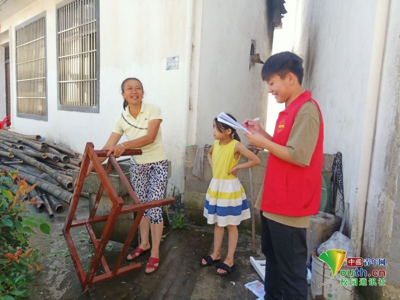 图为实践队队员实地走访当地居民,发放调研问卷,了解邱山村发展现状与群众满意程度。 中国青年网通讯员 黄晓洁 摄
