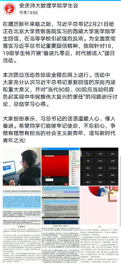 QQ视频、腾讯会议、Zoom会议……各种视频通话软件轮番上阵。“为了这次的线上团日活动能够顺利举办,我们提前对会议软件进行了测试,确保们每一位同学都能够顺利加入。”数学系2019(7)班的班长杨本定是这场会议的主持人,他表示“虽然是隔着屏幕的团日活动,不能面对面的交流,但是大家都很踊跃地表达自己对学习习近平总书记回信精神的想法与感受。”