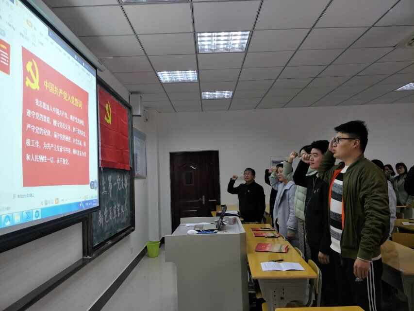 大会由李会葆老师主持并宣布大会开始,大会第一项,李老师带领全体人员起立奏唱《国际歌》,铿锵的歌声不仅响彻教室,更加把歌曲的意义渗进了每一位党员的心里,希望大家铭记于心。激昂的歌声过后,大会进入了第二项,于涛学长带领全体人员进行入党宣誓。举起的右手是我们肩负起的重担,口中的誓词是我们决心的见证,坚定的眼神使我们忠诚的彰显,誓词的每一个字都刻在了我们的心里,永不磨灭。大会第三项,由来自2016级应用统计学的江思雨同志代表预备党员发言,她表示严格要求自己,决不辜负组织上的信任。接着,数公司党支部书记钟金标老师对新进的预备党员表达了祝贺,并语重心长的告诫大家要时刻牢记自己的党员身份,对自己的要求要比一般人更高更严格,努力让自己成为一名优秀的党员,将理论联系实际,用实际行动来证明自己。最后,由支部书记李会葆老师对这次新党员宣誓活动进行了总结并且说明了本学期党员活动的相关事项。