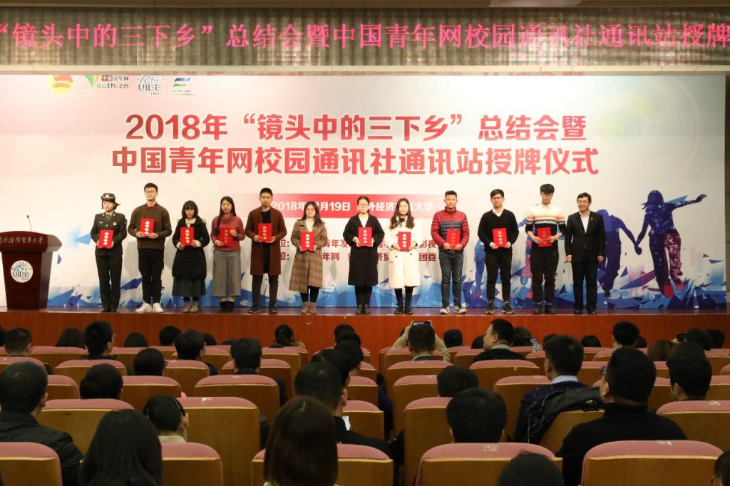 12月19日下午,2018年“镜头中的三下乡”总结会暨中国青年网校园通讯社通讯站授牌仪式在对外经济贸易大学隆重举行。团中央青年发展部副部长刘钢,团中央青年发展部实践教育处处长柏贞尧,团中央网络影视中心党委委员、中国青年网副总裁、总经理金锐,对外经济贸易大学党委副书记文君等领导嘉宾,以及全国300余所高校的600余名师生代表参加本次活动。公司周的玲老师、陈守莉老师和获奖员工代表蒋毅康、刘海东参加颁奖仪式。