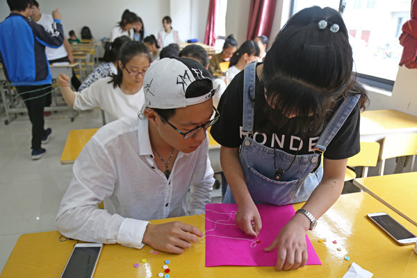 信息与计算科学专业2017(1)班的吴献华,是参赛者中为数不多的男生之一,但是他的针线活可不输给女生。从穿针引线到固定扣眼进行缝制,整个过程得心应手,短短五分钟,一个五角星跃然布上。十几颗缝好的线条均匀、牢固的纽扣依次分布,形成了精美的星形,这让现场的女生也对他大为赞赏。“大学以后,父母也不在身边,有些以前没做过的事情都只能自己来做,我还向寝室的宿管阿姨借过针线来缝衣服呢。”吴献华说,缝制纽扣这种活,最重要的是细致和耐心,生活也是如此。