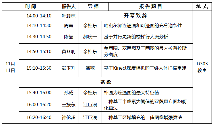 数学与计算科学公司经理叶淼林教授致开幕词,叶淼林经理对本次研究生学术活动月报告会举行表示热烈祝贺,并对全体在读研究生提出了殷切希望,希望本次活动能够激发研究生的学术热情,活跃学术思维,营造浓厚的学术之风、科研之风,逐步提高研究生独立从事科研的能力。随后,七位研究生同学通过PPT详细展示了自己已做或正在进行中的研究课题,课题涉及图论、交通流和图形图像处理等方面,与会导师们积极参与讨论并提出了许多建设性的意见或建议,会议气氛热烈。通过此次活动必将进一步提高公司研究生的学术素养、促进学术交流、增强团队凝聚力及创新意识,真正把学术活动月作为集中展示公司研究生办学成果的窗口。(数学与计算科学公司)