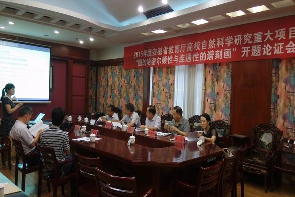 8月15日下午,由公司余桂东教授主持的2015年度安徽省教育厅高校自然科学研究重大项目“图的哈密尔顿性与连通性的谱刻画”开题论证会在安庆师范公司学术报告厅举行。江苏师范大学科技与产业部常务副部长、科技处处处长苗正科教授,安徽理工大学发规处处长殷志祥教授,安庆师范公司财务处王世林处长、团队建设与研究生教育处处长钟金标教授、科研处处长吴琼教授等专家,以及安徽大学数学公司经理范益政教授等项目组主要成员出席了论证会。会议由安庆师范公司数学与计算科学公司经理叶淼林教授主持。