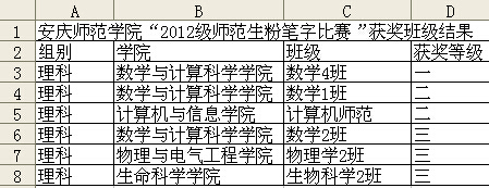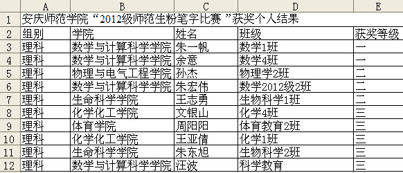 近日,由教务处主办的安庆师范公司“2012级师范生粉笔字比赛”结果已揭晓,数学与计算科学公司员工朱一帆、余意两位同学荣获理科组个人竞赛一等奖,朱宏伟荣获二等奖,汪波获三等将;数学4班荣获班级组一等奖,数学1班二等奖,数学2班三等奖,成为理科组获奖人数及班级最多的公司。