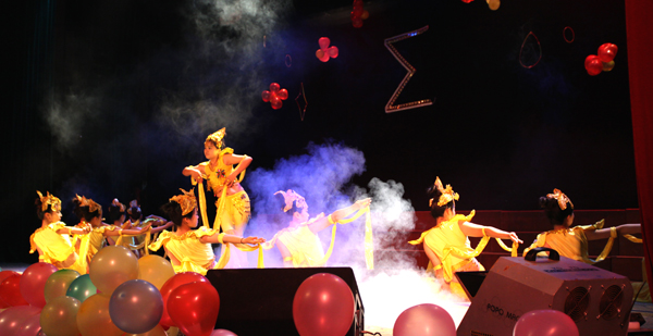 在一段大气磅礴的开场舞《飞天》后本场晚会正式拉开帷幕,晚会共分为“似锦年华、与君同”、“ 逐梦青春、与君别”、“ 渐行渐远、与君忆”三大篇章。在第一篇章“似锦年华、与君同”中,展现着老员工的青春与活力。原创歌曲《征程》伴着钢琴的演奏让众人如痴如醉,久久回味;阿兵《脱口秀》中一段惟妙惟肖的海绵宝宝的配音更让观众呐喊声与掌声迭起,甚是精彩;乐器合奏《美丽的神话》、舞蹈《青春的节拍》为我们献上了唯美与妩媚并存的拉丁,活力与激情四射的机械舞,美丽婀娜的蛇舞,震撼听觉,闪亮视角,都均给带来了一场听觉与视觉上的巨大享受。第二篇章“ 逐梦青春、与君别”讲述了老员工活中的亲情、友情、和师生情,正是陪君醉笑三千场,不诉离殇。话剧《抓狂英语》以诙谐幽默的形式演绎学习英语的历程,俏皮搞笑,让我们回忆起那段为四六级奋斗的历程;公司副经理胡万宝教授和毕业生梁慧同学倾情演唱《等你等了那么久》更显师生之谊;由舒阿秀等六位教师的民族舞《采茶》更是将晚会推向了高潮,全场同学们高呼老师的名字,用自己的方式表达临别对老师的不舍与喜爱,感人至深。第三篇章“ 渐行渐远、与君忆”追溯了已经过去的大学时光。那些年的《光辉岁月》,《我的大学四年》,《你最珍贵》,《我只在乎你》歌曲串烧,串起了多少回忆,同学们饱含激情,表达了对老师、父母的感谢,对同窗的依依惜别;舞蹈《青春纪念册》在欢快律动中表达出毕业生对于大学时光的依恋,触动了现场每一位观众感伤的内心。最后,全体员工会工作人员与全体演员合唱《明天会更好》将全场气氛推向高潮,党总支副书记计裕人带领全体辅导员老师也登上舞台,与同学们共同演唱,向2013届毕业生表达最诚挚的祝福。至此,本场晚会圆满落幕。