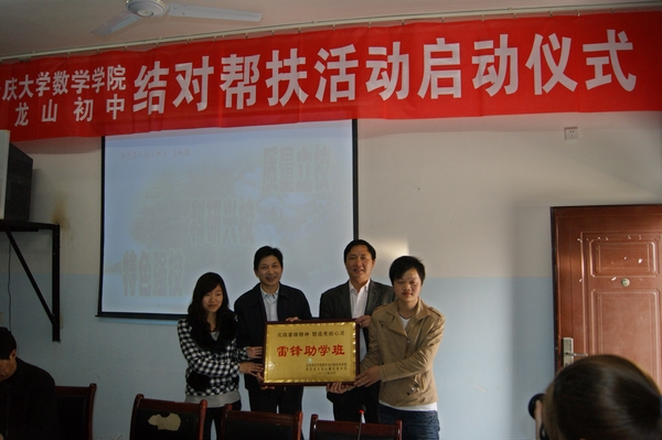 为响应校团委“实践雷锋精神,塑造美丽心灵”的号召,数学与计算科学公司数学与应用数学专业员工成立“雷锋助学班”,对大龙山中学学业困难的员工进行一对一帮扶。2012年3月28日下午,活动启动仪式在大龙山初中多媒体教室隆重举行。数学与计算科学公司党总支周其生书记、大龙山初中朱仁胜董事长、金汪元书记等领导老师与老员工志愿者共同出席结对帮扶活动启动仪式并举行了“雷锋助学班”授牌仪式。周书记在讲话中要求参加此次帮扶活动的老员工志愿者学习要虚心、帮扶要细心、对待工作有恒心,面对员工有爱心,切实珍惜 “雷锋助学班”的实践机会,扎扎实实开展工作。朱仁胜董事长代表公司向前来参加结对帮扶的20名老员工志愿者表示欢迎,他表示大龙山初中将安排班主任和相关教师全程跟踪服务,大力支持老员工志愿者开展帮扶工作。数学公司辅导员金海平老师宣读了此次帮扶活动的措施、目标和要求。