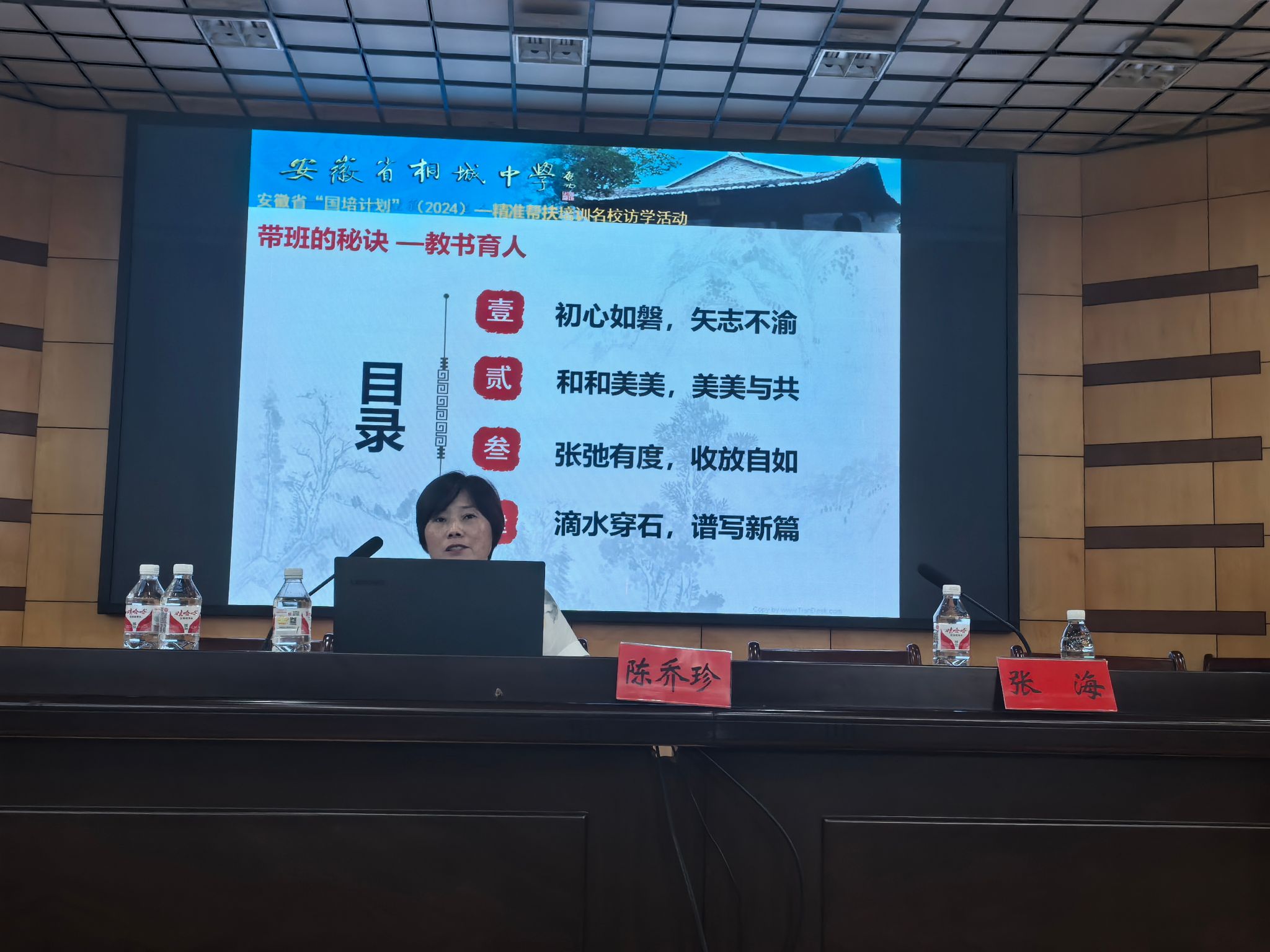 陈乔珍为名班主任班学员作了题为“如何做一个有智慧的班级引路人”的报告,与大家分享了自己二十二年的班主任工作经历。“初心如磐,矢志不渝”,教书育人必须以一颗进取的心加强阅读,要参加集体研讨,学习借鉴,随手记录工作日志;“和和美美 ,美美与共”,架起员工与任课老师之间的桥梁,培优补短,统一思想;“张弛有度,收放自如”,创建良性运行的班集体要求班主任做到以德立心、以情动人、以身作则,严而有格,爱而不纵。“滴水石穿,谱写新篇”以笃定之心、进取之志、博爱之情弘扬成人之道。