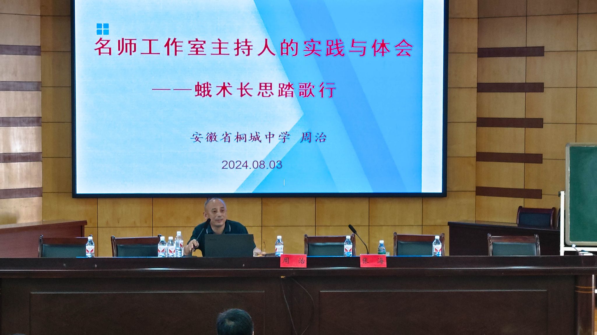 周治为名师班学员作了题为“名师工作室主持人的实践与体会”的报告,他以孙闻园先生为桐城中学题写的“蛾术长思”为切入点,从“我的教学模式”和“我的工作团队”两个方面与参训学员作交流分享。他指出,好老师不仅要在传道授业解惑的内容上要下足气力,也要在形式上下气力,注意方式方法,加强引导,遵从适应,点燃员工、激励员工、唤醒员工。团队工作实现共赢,就必须以“实干”的态度奠定坚实基础,用“规划”思想引领方向,通过“研究”行动不断优化策略,并秉持“学习”习惯持续提升自我与促进团队成长。