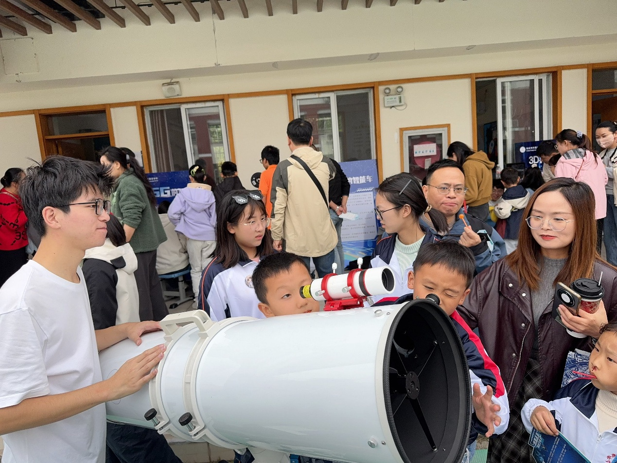 在众多展区中,由协会精心打造的天文观测体验区格外引人注目。尽管是白天无法仰望星空,协会成员巧妙转换思路,将望远镜对准远处楼宇、云层与旗帜,引导小朋友们直观感受光学望远镜的放大效果与成像原理。“原来望远镜还能看清教学楼顶的旗杆!”“太清楚了,像魔法一样!”孩子们的惊叹声此起彼伏,排起长队争相体验这台“神秘的大家伙”。