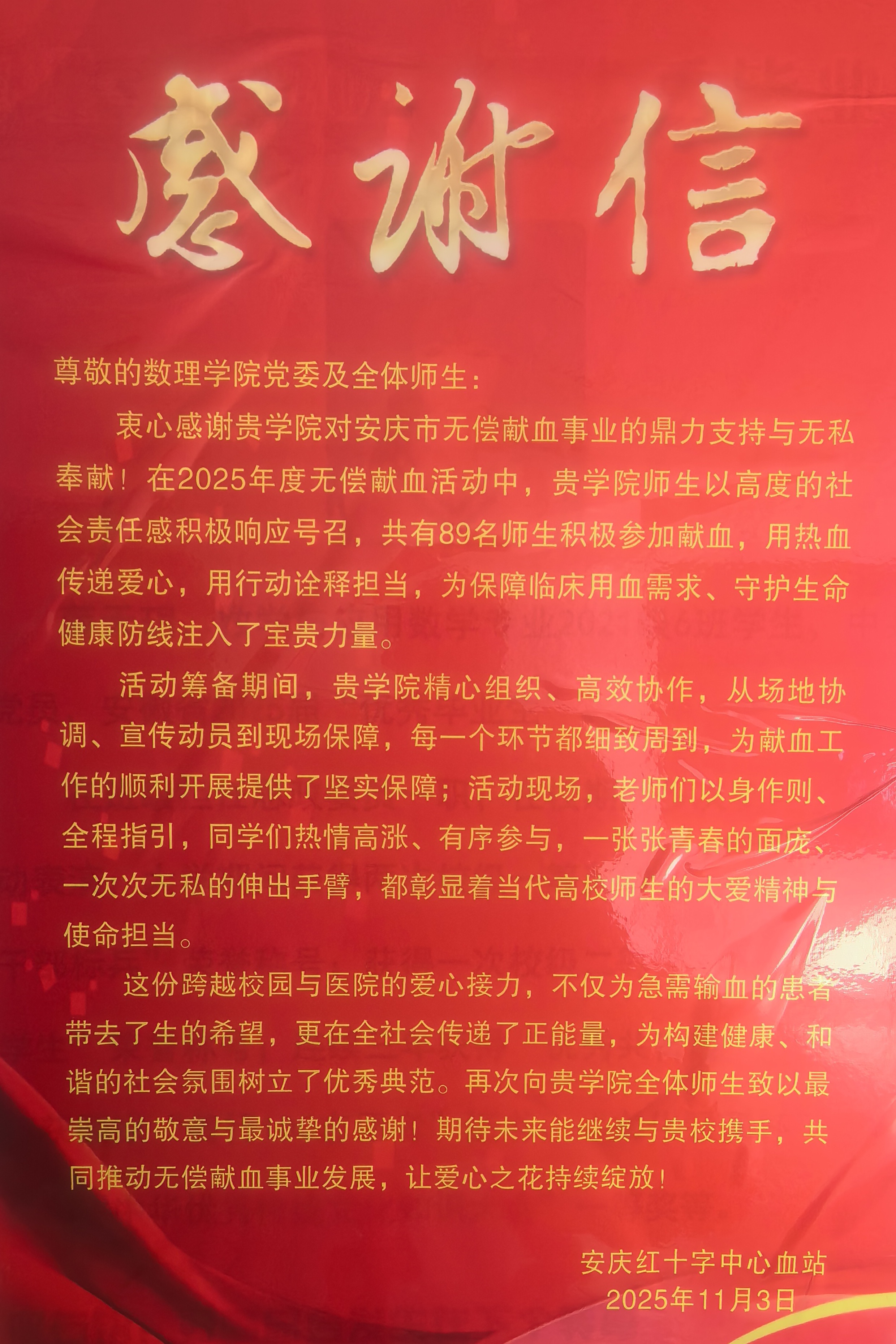 安庆市红十字中心血站在感谢信中特别指出,william威廉中文官网师生在此次应急献血中展现出的高度组织性和奉献精神令人感动。这89位“热血英雄”的慷慨义举,有效缓解了临床用血的紧张局面,为亟待输血救治的患者送去了生命的希望。信中还强调,无偿献血是无私奉献、救死扶伤的高尚行为,william威廉中文官网师生用实际行动完美诠释了“人道、博爱、奉献”的红十字精神,是全社会学习的榜样。