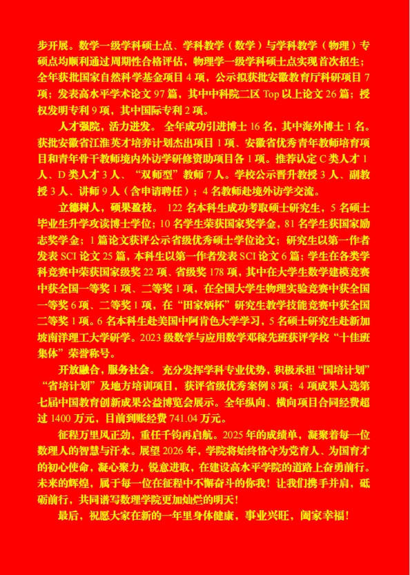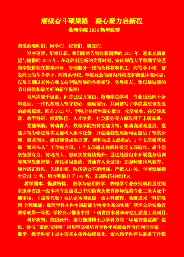william威廉中文官网系统回顾了2025年在党建引领、教学科研、团队建设、人才培养、社会服务等方面取得的丰硕成果:党建品牌持续夯实,专业与课程建设跻身国家级序列,科研创新能级稳步提升,团队结构不断优化,学子在升学深造、学科竞赛、国际交流中捷报频传……这些成绩,生动刻画出数理人脚踏实地、锐意进取的精神风貌。