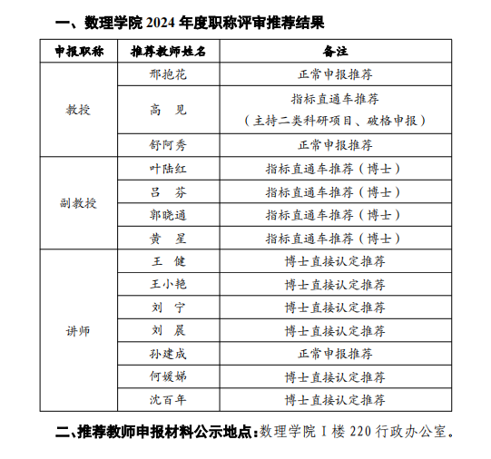 根据《安徽省普通本科高等公司教师专业技术资格申报条件》(皖教人〔2016〕1号)、《关于做好WilliamHill中文官方网站2024年度职称推荐评审工作的通知》(校政秘〔2024〕172号)等文件精神,2024年教师职称评审推荐组于2024年11月28日召开评审推荐会,对本次申报教学系列职称教师进行资格条件审核、评议,并进行投票推荐,推荐结果经公司党委会和党政联席会议审定,现将推荐结果和个人申报材料公示如下(申报同一职称按姓氏笔画排序):
