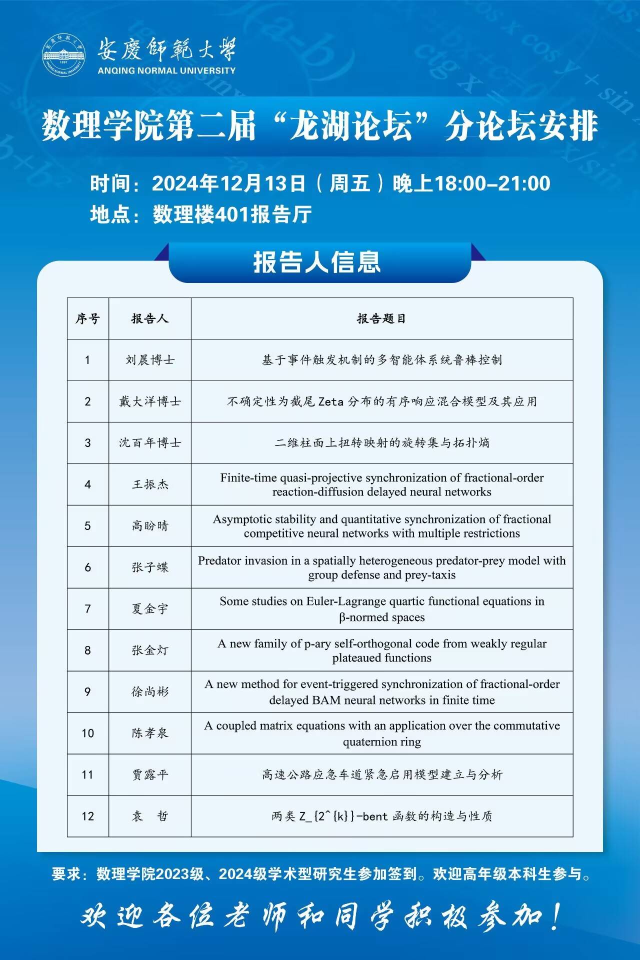 william威廉中文官网第二届研究生“龙湖论坛”分论坛报告安排