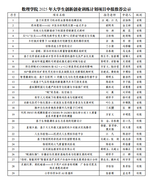 根据公司《关于开展2025年老员工创新创业训练计划项目申报工作的通知》(教学〔2025〕43号)等文件要求,经公司各专业初审、公司评审组评议、公司研究,拟推荐申报2025年老员工创新创业训练计划项目省级18项、校级11项,现予以公示(详见附件)。